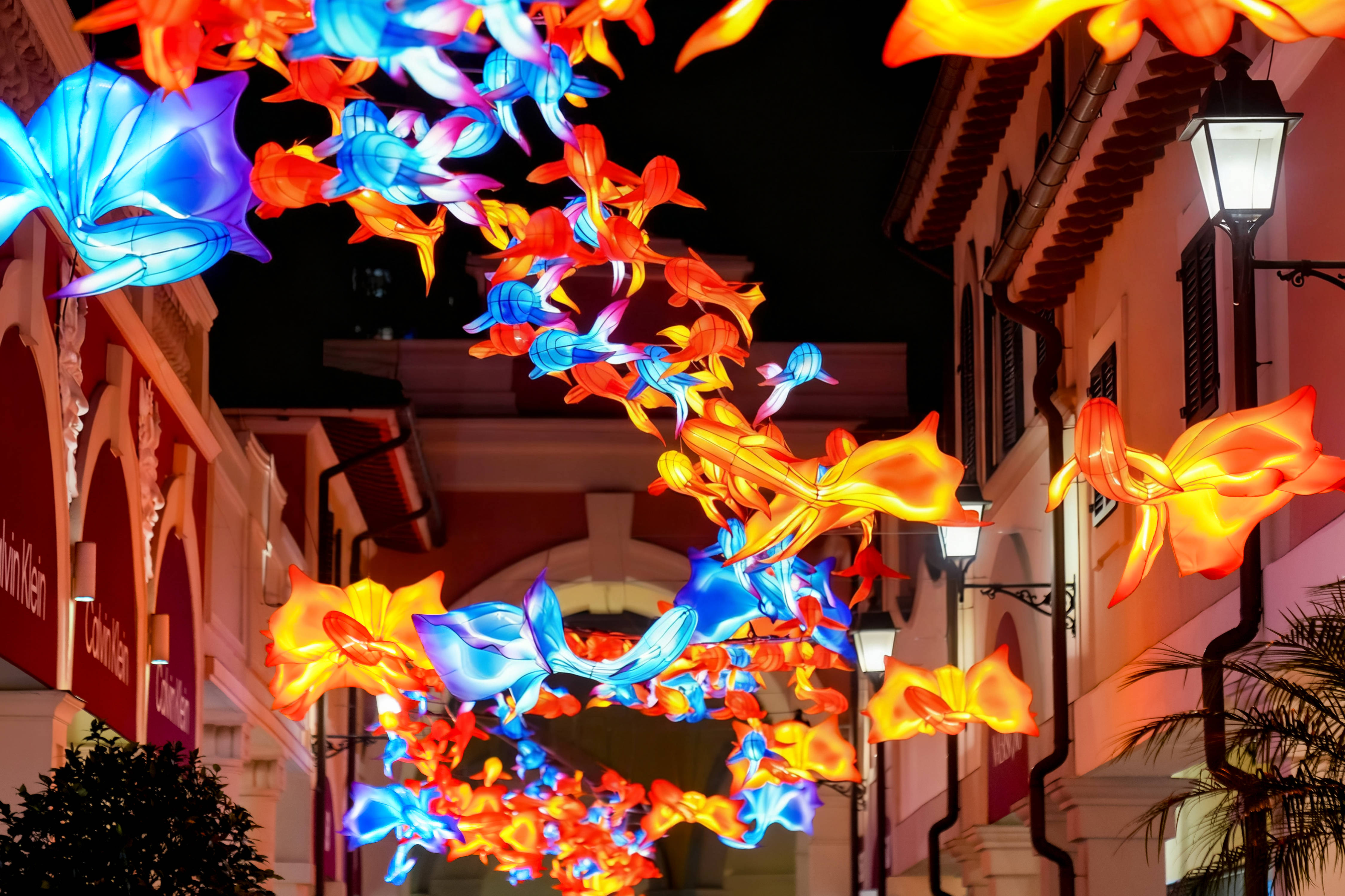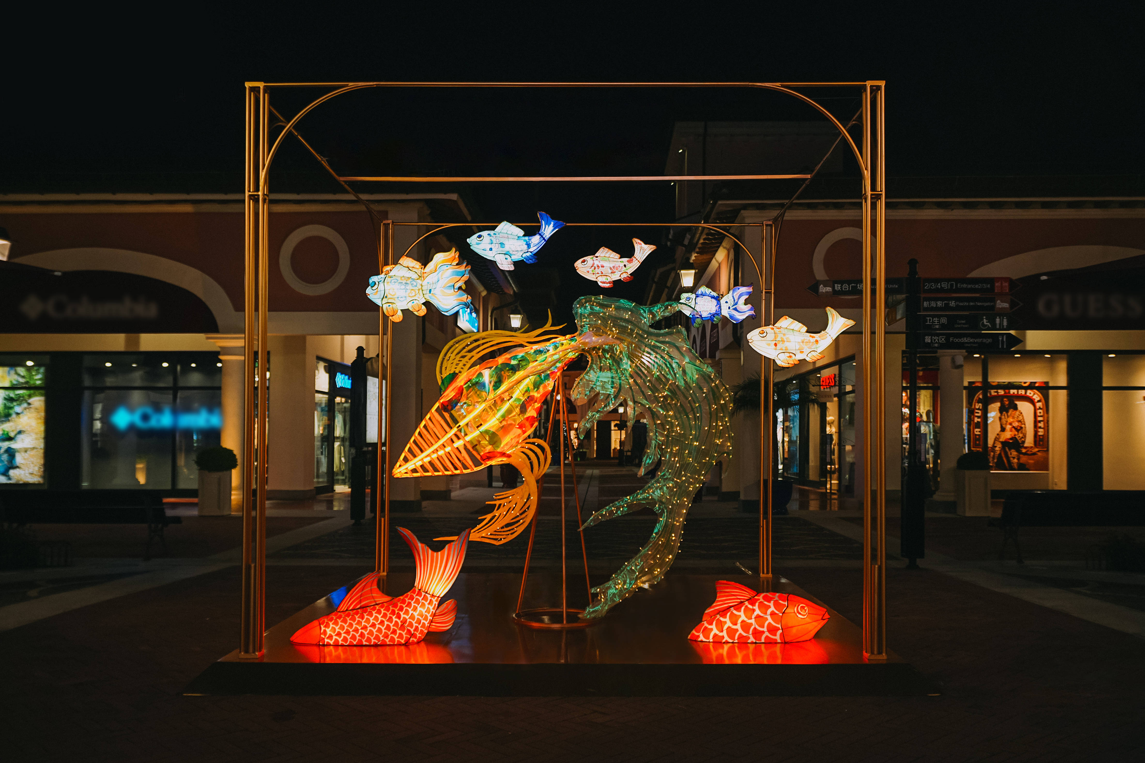 周年庆期间,五组以岭南传统民俗文化为展现主题的艺术装置,运用彩灯工艺,将中国文化中的“鱼跃龙门”等吉祥寓意,以及“百鲤呈祥”的灵动姿态生动呈现于意式建筑群落之间,带来意式优雅与在地文化相交融的独特沉浸式体验。